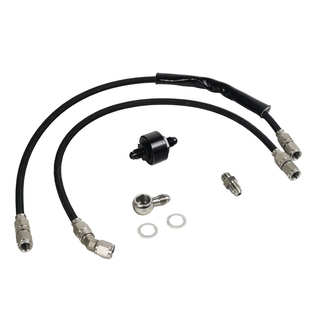 Unlike factory steel pipes that are prone to clogging from the restrictive internal filter in the OEM oil block, our high-flow braided line and in-line filter system ensures uninterrupted oil flow to your turbo.